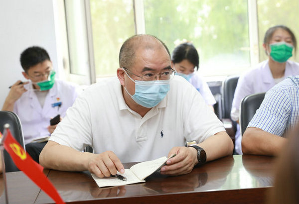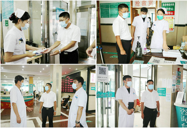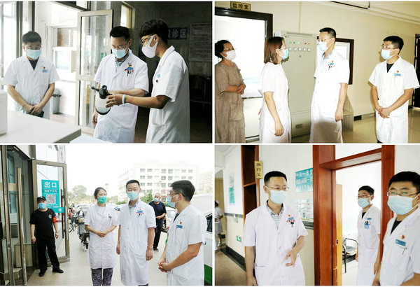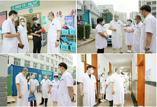 7月30日上午, 党委书记丁国旭、院长、党委副书记武立刚、副院长鲍红光、刘晖、赵玉环、纪委书记李亚洲带领相关科室负责人分别前往门诊、急诊、发热门诊、内科病房楼、外科病房楼、心理调适楼、学生公寓楼、规培基地楼等地,对全院疫情防控工作进行了大督导大排查。