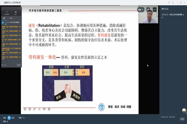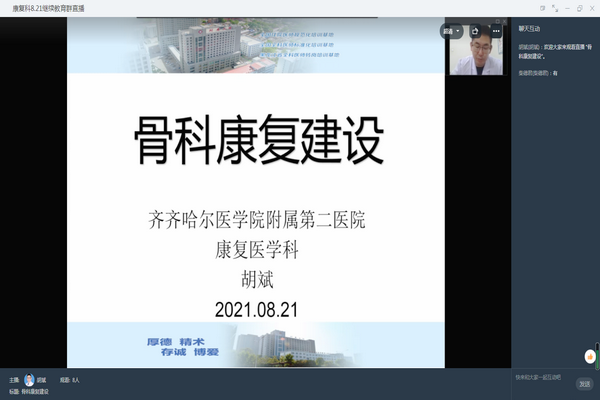 8月21日上午,康复医学科举办2021年骨科康复一体化新进程线上学习班,康复医学科副主任胡斌主持会议并作讲座,骨外科四病区主任刘洋等作专题讲座,全省多家医疗机构100余名康复同仁参加会议。