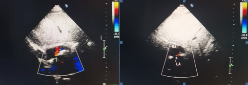 卵圆孔未闭的常规心脏超声检查可见房间隔中部左向右红色过隔血流信号,如下图。