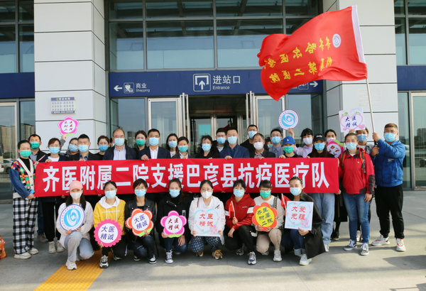 9月28日中午,齐医附属二院支援哈尔滨市巴彦县抗疫医疗队26名队员(6名医生、20名护士)火速集结启程出征。党委书记丁国旭、院长、党委副书记武立刚、副院长鲍红光等领导为援助巴彦县医疗队员送行,医疗队员与市里其他医疗队伍会师共赴哈尔滨,全力以赴支援巴彦县隔离点驻点健康监测、全员核酸检测等任务。
