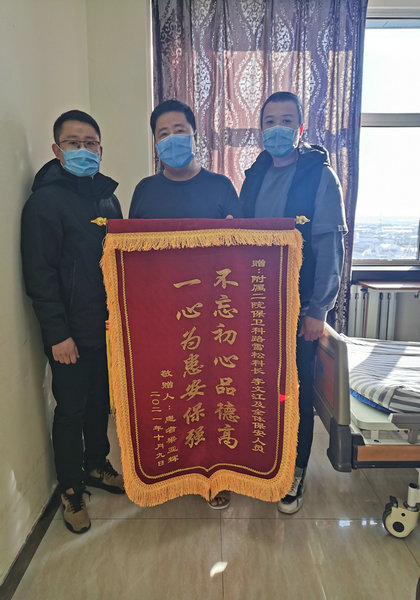10月12日上午,肾内科患者梁先生将一面写着“不忘初心品德高 一心为患安保强”的锦旗送给保卫科副科长路雪松和干事李文江,感谢李文江为其找回遗失的手机。