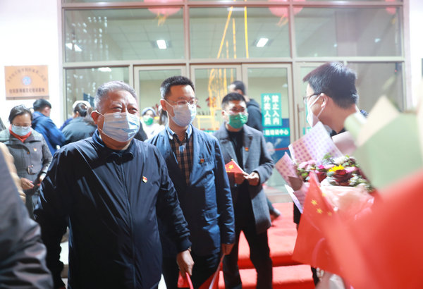 齐医附属二院党委书记丁国旭(左二)迎接医院26名抗疫医疗队员回家