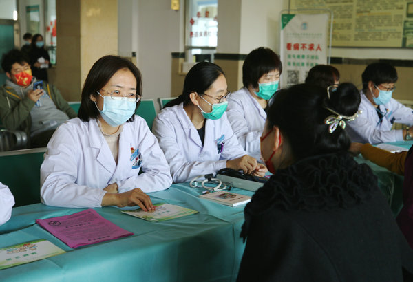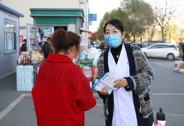 保健科副科长刘文瑶对前来就诊患者发放宣传手册