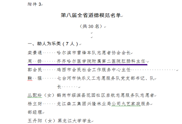 12月3日,由省文明委举办的第八届全国和全省道德模范发布仪式在哈尔滨举行,齐医附属二院肛肠外科主任周扬荣膺第八届黑龙江省“助人为乐”类道德模范称号。