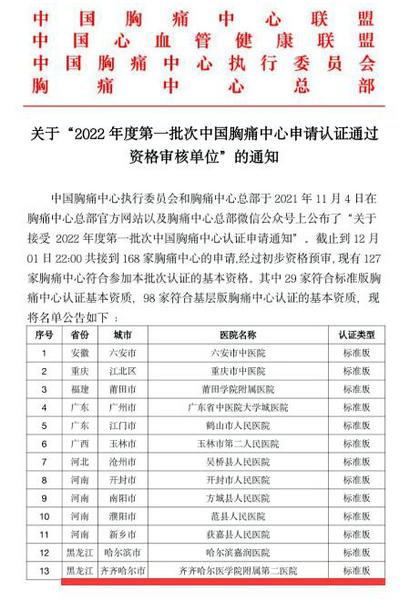 近日,中国胸痛中心执行委员会和胸痛中心总部在胸痛中心总部官方网站以及胸痛中心总部微信公众号上公布了“关于接受2022年度第一批次中国胸痛中心认证申请通知”,截止到12月01日22:00共接到168家胸痛中心的申请,经过初步资格预审,现有172家胸痛中心符合申请认证的基本资格。其中98家符合基层版胸痛中心认证的基本资质,齐医附属二院名列其中。