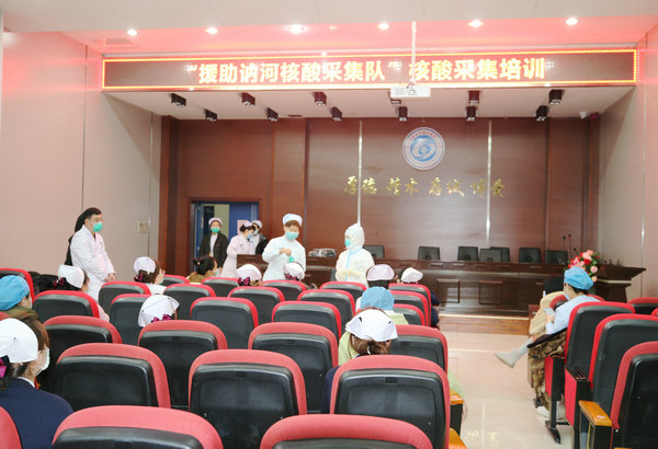 12月13日下午,按照市卫健委关于组建援助讷河核酸采集队的通知,齐医附属二院紧急组建由20名护理人员组成的核酸采集医疗队,奔赴讷河开展为期15天的核酸采集任务。出发前,医院在临床技能中心一楼多功能厅召开“援助讷河核酸采集队”核酸采集培训会,院长、党委副书记武立刚作动员讲话,副院长鲍红光安排部署具体工作,医务部主任于海明提出工作要求,护理部主任孙晶主持培训会并讲话,感控科副科长张志伟作院感防控知识培训,重症医学科护士长颜红霞进行咽拭子采集及穿脱防护服培训,20名核酸采集队员参加培训会。