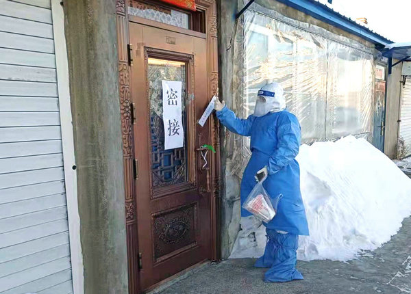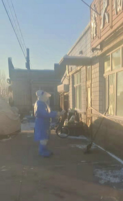 在志愿者带领下,队员们挨家挨户打开封条,核对患者采取鼻咽采集方式采集,严格按照一人一管的原则。在东北进了九的天气格外寒冷,由于手部要一直放在外面,队员们的手开始冻得有些不听使唤,尤其在消毒后,消毒液未干,风一吹就感到刺骨的疼,手指只要做一个动作就感到麻木,面屏也很快就结冰,看不清路,走路变得很艰难,但我们都深知自己来这里的任务,作为援助的医疗队员我们不会抱怨,更不会退缩,咬紧牙关,互相鼓励、加油,在这样的情况下,我们顺利完成了一天的核酸采集工作。