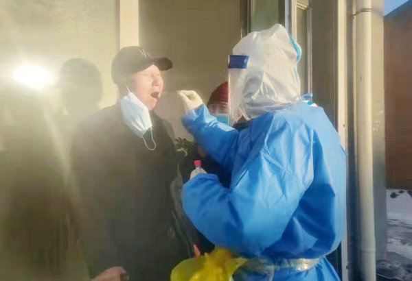 12月15日5时50分,我们准时出发,去往援助地长发镇。这是我第一次穿防护服,队长彭飞飞让我与一位有经验的同事一组,面对未知的工作,我不那么紧张,按照工作要求,我们要逐户到村民家采样,不能进入室内,所有操作都在室外完成,刚开始出去还不觉得冷,但是采集五位村民后,我的手已经冻僵,每采一位村民后进行一次手消毒,手部慢慢失去知觉。核酸采样过程中要与采集者进行交流,时间久了防护口罩内有水蒸气,形成水珠从下巴延着脖子流到胸前,我克服了这些困难,到中午11点半圆满完成上午的采集工作,在回宾馆的路上,看见阳光撒在大地,我觉得自己很有成就感,用微薄之力,守护一方人,理解了武立刚院长出征前对我们说的话:我们是讷河这场战疫的终结者。