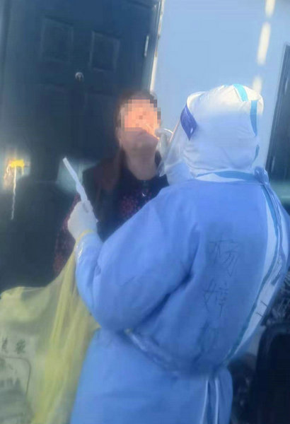 齐医附属二院核酸采集队员杨婷婷为居民采集核酸