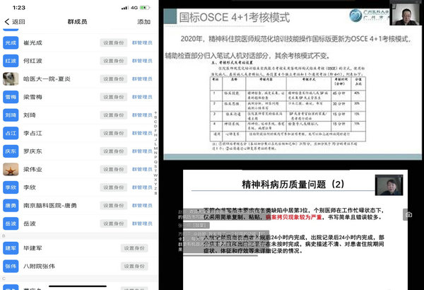 专家们针对精神学科的特点,围绕“精神科住培基地认定标准解读”“精神科住培培训细则解读”“如何加强对住院医师门诊带教”“如何开展入科教育”等主题,采用线上直播理论学习操作培训方式,集中授课、互动讨论、教学督导、考核评分等相结合,特别邀请医院规培师资王文斌主任及刘洋主任进行体格检查及技能操作教学,为精神科专业基地骨干师资规范化带教提供指导。