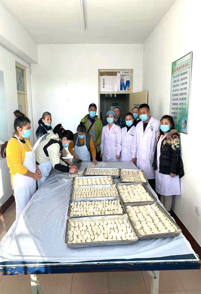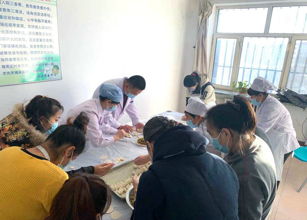 饮食服务中心副主任徐迪、精神卫生中心护理部副主任霍红亮等职工与患者一起包饺子