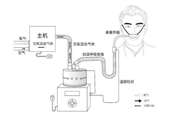 经鼻高流量湿化氧疗(HFNC)是指一种通过高流量鼻塞持续为患者提供,可以调控并相对恒定的吸氧浓度、温度和湿度的高流量吸入气体的治疗方式,该治疗设备主要包括空氧混合装置、湿化治疗仪、高流量鼻塞以及连接呼吸管路。