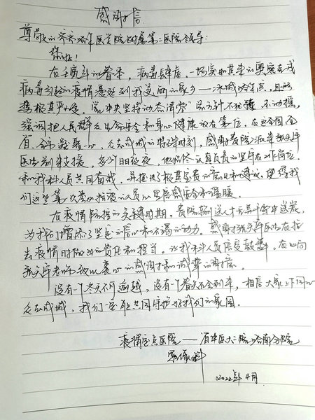 在壬寅年的春季,病毒肆虐。一场突如其来的奥密克戒病毒引起的疫情漫延到我美丽的家乡——冰城哈尔滨,且形势极其严峻。党中央坚持的“动态清零”总方针不犹豫、不动摇,强调把人民群众生命安全和身心健康放在第一位。在这全国全省、全市凝聚一心、众志成城的特殊时刻,感谢贵院派来张天宇医生前来支援。多少个日夜夜,他始终认真负责的坚守在工作岗位,和我科人员共同奋战,并提出了极其宝贵的意见和建议,使得我们这些第一次参加抗疫队员的心里倍感安全和温暖。