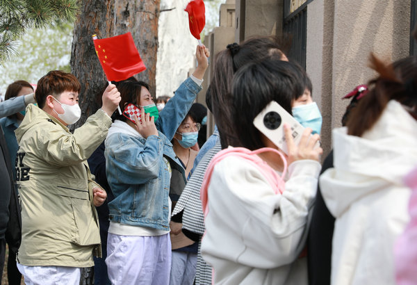 到达驻地后,队员们走下大巴回到了家乡,到处欢呼雀跃、夹道欢迎,院领导们频频向队员们挥手致意,职工代表们拉起条幅、挥舞手举牌大声呼喊向英雄们致敬,日夜牵肠挂肚的父母眼底泛起了泪花,一直在身后默默支持的爱人如释重负,朝思暮想的孩子奶声奶气地呼唤着妈妈,昔日并肩作战的同事们在车上装扮起欢迎回家的条幅,一面面五星红旗迎风飘扬,让逆行英雄们充分感受到了家人们的的盛赞和礼遇,他们不停地向大家招手致谢,激动的说着:“我们回来了,我们胜利了,我们回家了......”