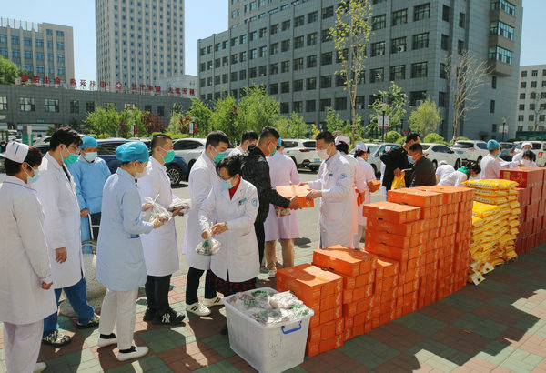 医院领导为前来带领的救治医疗队员家属发放慰问品