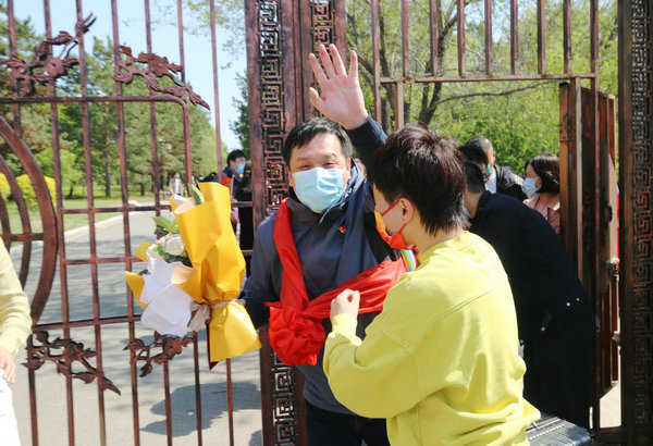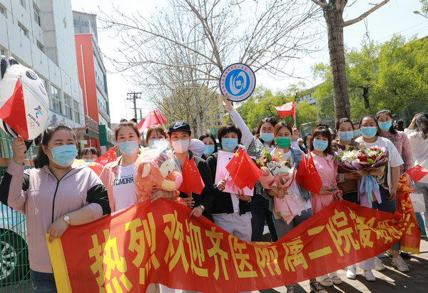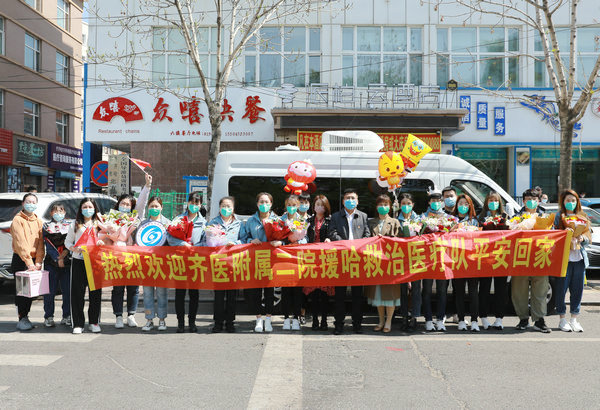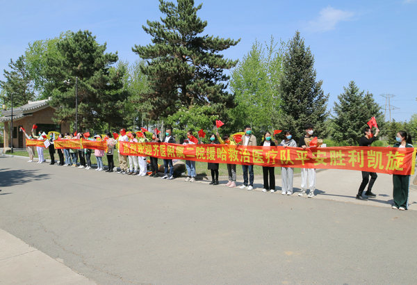 5月18日下午,齐医附属二院70名援哈救治医疗队员圆满完成抗疫任务,集中隔离结束后,从隔离酒店返回家中,与分别了两个多月的家人、同事团聚,平安回家!党委书记丁国旭、院长、党委副书记武立刚、副院长鲍红光、赵玉环、纪委书记李亚洲、党委委员、人事科长黄莹等院领导、职工代表及家属,分别前往水师温泉度假村、派柏云酒店隔离观察点迎接英雄回家。