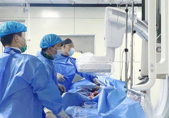 血管外科主任王颖(中)为患者行主动脉夹层覆膜支架腔内隔绝术