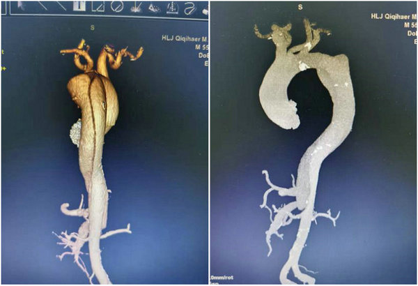 55岁的李先生,因右手痛风石就诊于齐医附属二院骨外科住院治疗,在院期间患者突然一股疼痛感从胸部及背部袭来,令他疼痛难忍,休息后仍不能缓解,骨外科医生立即邀请血管外科进行会诊,经过血管外科王颖主任的一系列专科查体及询问病史初步诊断为主动脉夹层,必须转科手术治疗。医院立刻为李先生开通绿色通道,对他进行血压监测及主动脉CTA检查,结果提示:李先生为B型主动脉夹层动脉瘤且高血压三级,血管撕裂严重,随时可能会出现动脉破裂、急性循环衰竭或猝死等生命危险。