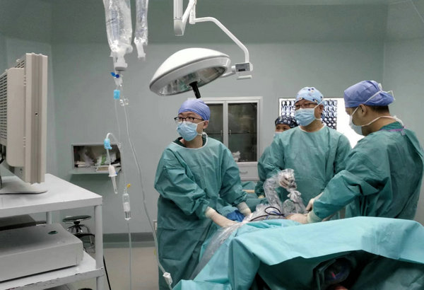 骨外科四病区主任刘洋(中)为患者行(脊柱内镜)椎间孔镜下经侧后路椎管减压髓核摘除射频消融术
