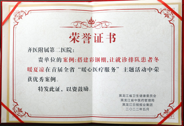 近年来,齐医附属二院厚植人文关怀理念,坚持以“人民健康为中心”,开展系列暖心医疗服务活动,提升医疗服务质量,打造有温度医院,为百姓提供了优质、安全、便捷的医疗服务,构建了和谐医患关系。制作并推送《搭建彩钢棚,让就诊排队患者冬暖夏凉》暖心医疗服务作品参与黑龙江省首届“暖心医疗服务”主题系列活动,在评选活动中名列前茅,赢得了社会各界人士及评委会好评,荣获“优秀医院”“优秀案例”双荣誉。展望未来,医院将立足新起点,以人民健康为中心,提供优质医疗服务,切实提升医疗服务质量和技术水平,努力打造技术一流、服务一流的品牌医院,为全省健康事业高质量发展,助力龙江全面振兴、全方位振兴,作出新的更大贡献。(撰稿:宣传科 李征)