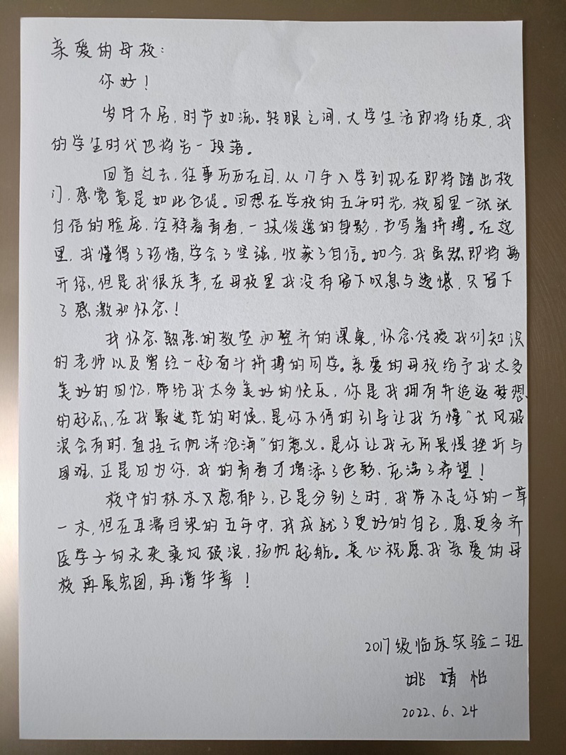 时光荏苒,大学生活已悄悄流逝。想对你说的话,却还没来得及吐出口;想和你去的地方,也还没来得及走一走。时光流转,教学楼中的上下求索,临床实习的璀璨绽放,运动场上的声声呐喊,都在这一刻浮现眼前。今天,要正式和你说再见了,爱你齐医,爱你附二,此生不变。