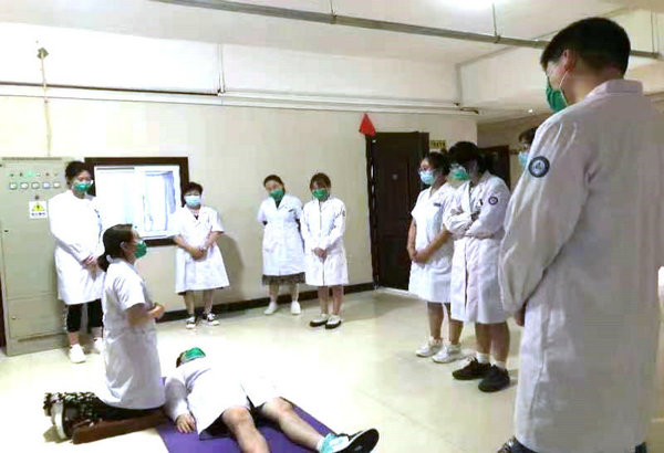 各科室工作人员、学生分别分成小组对心肺复苏术整体救治流程进行了现场演示,重点对心脏按压频率、深度、清理口腔异物、开放气道、人工呼吸等要领进行重点学习,确保此次培训活动取得实效。