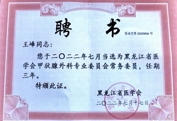 近日,黑龙江省医学会在哈尔滨市召开了甲状腺外科专业委员会换届会议,齐医附属二院普外科主任王峰光荣当选常务委员。