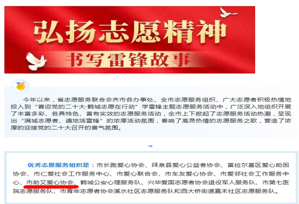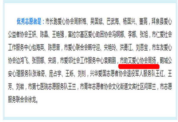 近日,省志愿服务联合会齐市各办事处、全市志愿服务组织、广大志愿者积极热情地投入到“喜迎党的二十大 鹤城志愿在行动”学雷锋主题志愿服务活动中,市助艾爱心协会会长、齐医附属二院肛肠外科主任周扬在此次活动中荣获“优秀志愿者”光荣称号。