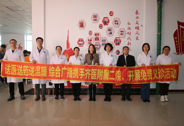 3月28日上午,齐医附属二院携手市综合广播赴梅里斯区雅尔赛镇开展“送医送药送温暖”义诊活动。医院党委委员、人事科科长黄莹、医合办副主任时光组织带领血液风湿科、心血管内科、神经内科、内分泌科、普外科、超声科7名专家一行13人携带超声、心电图机等设备为当地百姓爱心义诊。