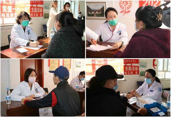 仪式结束,专家们迅速投入到了紧张忙碌的爱心义诊宣传活动中。得知齐医附属二院专家前来义诊,义诊百姓也早早来雅尔塞镇党群服务中心排起了长长队伍等待专家诊治。义诊期间,我院专家们耐心为每个百姓做着健康咨询、体检和指导,发放健康宣传资料,进行超声、心电、血压测量等检查。详细询问就医群众的生活习惯和身体状况,并针对个人身体状况提出相应的诊疗建议,解决健康问题,用仁心大爱切实提升村民们的获得感、幸福感和满意度。