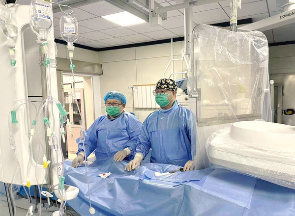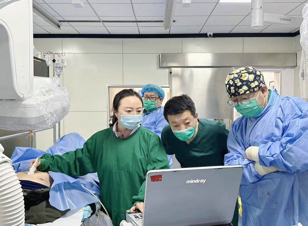心血管内科一病区主治医师吴大鹏(右)等为患者行卵圆孔未闭(PFO)介入封堵术
