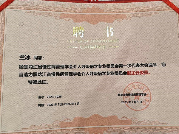 7月1日,黑龙江省慢性病管理学会介入呼吸病学专业委员会成立大会暨学术研讨会在哈尔滨市召开,齐医附属二院当选基层副主任委员单位,呼吸内科一病区主治医师兰冰当选基层副主任委员。