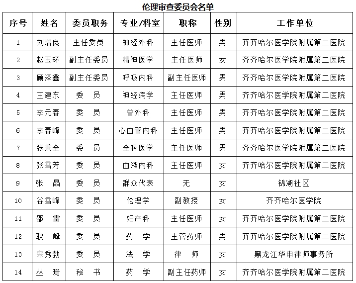 名称:齐齐哈尔医学院附属第二医院医学伦理审查委员会