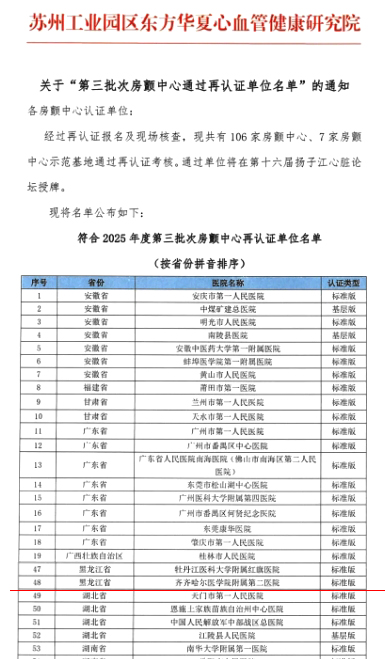 近日,苏州工业园区东方华夏心血管健康研究院正式公布了“第三批次房颤中心通过再认证单位名单”,齐医附属二院房颤中心顺利通过国家房颤中心总部的严格复审,标志着医院在房颤的规范化诊疗、多学科协作及区域协同救治等方面持续达到国家标准,诊疗能力与服务品质再获权威认可。