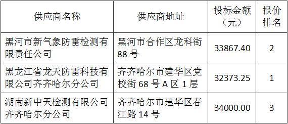 本次询价最低供应商:黑龙江省龙天防雷科技有限公司齐齐哈尔分公司,进入第二轮院内议价环节。