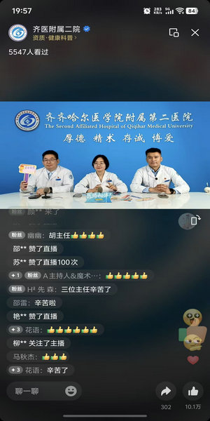 齐医附属二院拥有雄厚的医疗与教研资源,未来,医院将定期推出涵盖慢性病管理、急救技能、妇幼保健、中医康复等不同领域、不同主题的科普直播,同时鼓励更多青年医师参与,让权威医学知识飞入寻常百姓家,用实际行动践行“健康中国”战略,创新服务模式,提供人文关怀,提高公众健康素养,提升百姓健康水平。(撰稿:宣传科 高秀文 摄像:宣传科 赵萌 责编:宣传科 高秀文 一审:刘洋 胡斌 李硕 二审:高秀文 三审:刘增良)