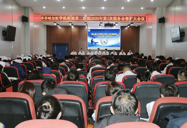 2026年1月8日,齐齐哈尔医学院附属第二医院召开主题为“凝心聚力启新程·智汇名医谱新篇”的2026年第一次院务会。会议由医院办公室副主任王志超主持,院领导班子成员、各科室负责人在多功能厅现场参会,其他科室人员在线上参会。此次会议立足“新班子、新理念、新团队、新技术、新征程、新篇章”六大核心维度,全面部署新年重点工作,为医院高质量发展擘画新蓝图。