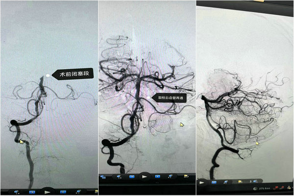 57岁张先生,因突发意识不清3小时紧急入院确诊脑梗死,患者病情危重,随时危及生命,给与静脉溶栓后症状改善不明显,在母玉元主任的指导支持下,许德超医生迅速桥接实施急诊基底动脉取栓术,闭塞血管成功再通,术后患者意识恢复清晰,四肢活动自如,康复效果显著。