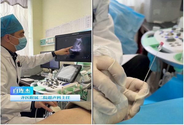 一位因“急性化脓性胆囊炎”入院的患者,收治于消化内二科。入院时,患者已腹痛多日并伴有高烧。鉴于传统抗感染治疗起效较慢,而病情紧急,为争取救治时间,消化内二科范立君主任与超声科介入团队联合协作,决定为患者实施急诊手术。在超声科主任白连杰的主持下,团队成功为患者进行了超声引导下经皮肝胆囊穿刺置管引流术(PTGD)。术中,医生在超声影像的动态监测下,将穿刺针精准置入胆囊,引出脓性胆汁,患者腹腔内高压得到迅速缓解。