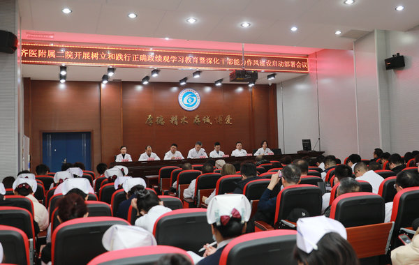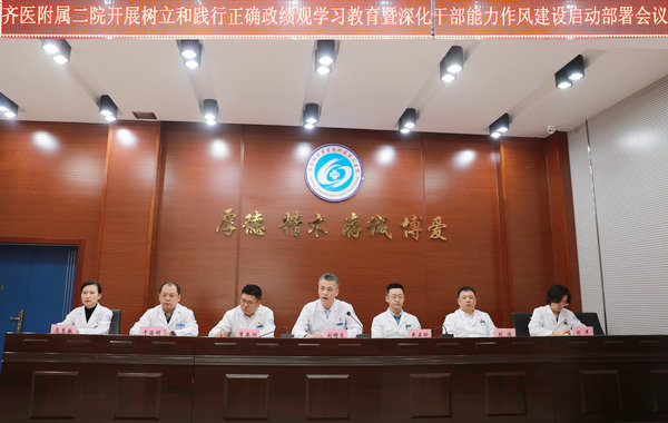为进一步贯彻落实党中央和省委、学院党委在全党开展树立和践行正确政绩观学习教育和2026年深化干部能力作风建设的部署要求,3月12日下午, 齐医附属二院党委在临床技能中心多功能厅召开树立和践行正确政绩观学习教育暨深化干部能力作风建设启动部署会议。党委书记刘增良同志作动员部署讲话, 院长、党委副书记武立刚同志解读实施方案,党委副书记李亚洲同志主持会议并传达学院党委会议精神,医院领导班子成员、各党支部书记、现职中层干部参加会议。